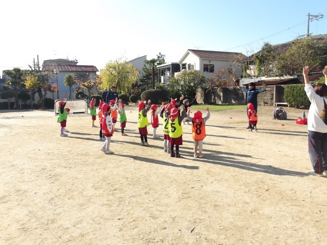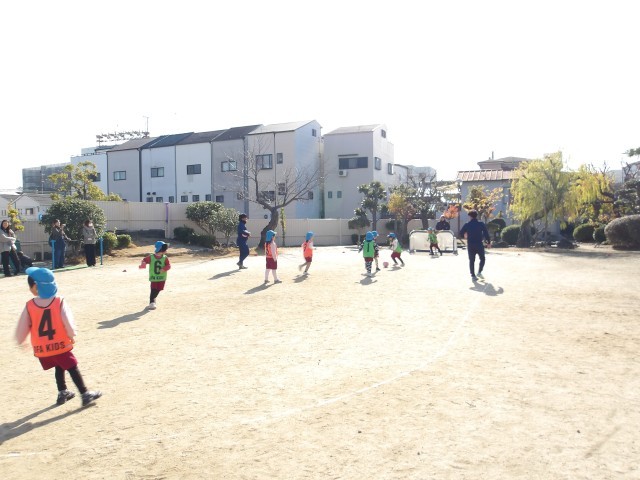 園庭でサッカー遊びを楽しみました。今年、3回目なので、子どもたちも運動することを楽しみながら、サッカーの形式を分かって遊んでいました。試合形式でしたり、シュートをしたりして、しっかりと体を動かしている子どもが多くいました。