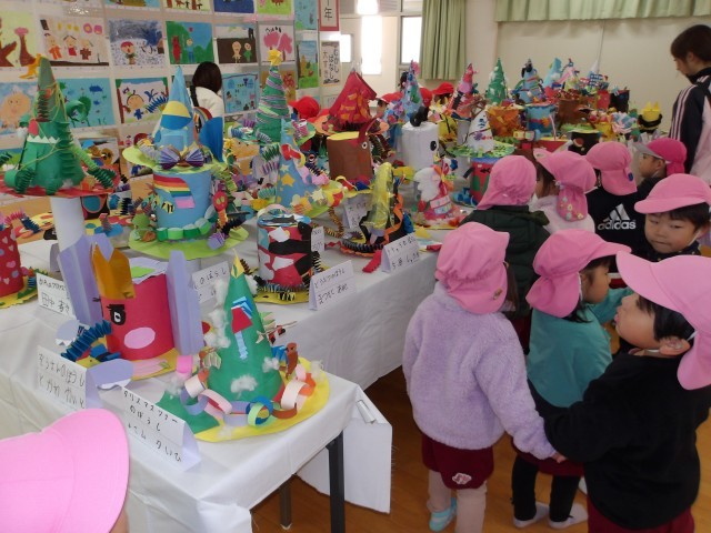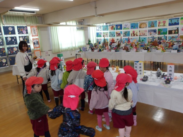 住吉小学校の作品展を参観させていただきました。自分のお兄ちゃんやお姉ちゃんの作品を探したり、昨年まで幼稚園にいた友達の作品を探したり、「読み聞かせをしてくれたお兄さんお姉さんの作品だね」と見たりしながら、楽しませていただきました。いろいろな作品があり、子どもたちは興味をもって見ていました。