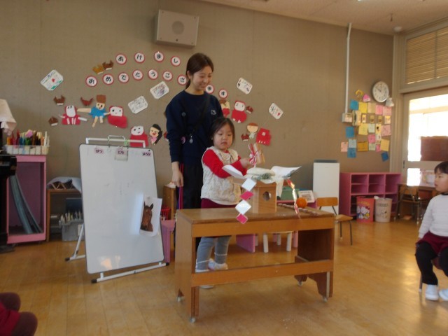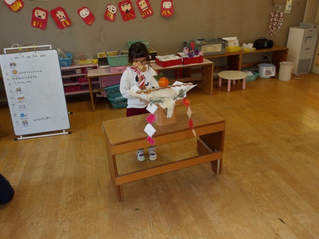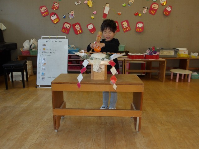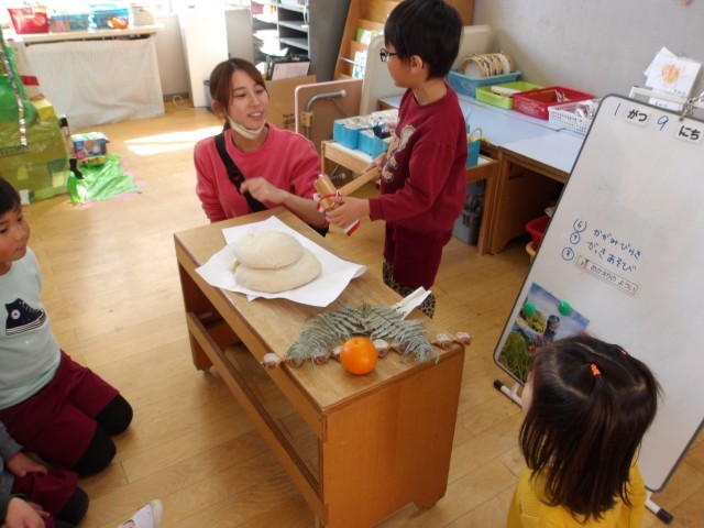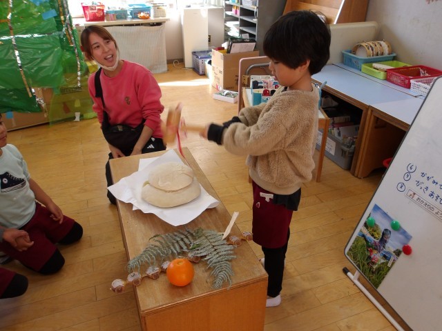 昨日園長先生から鏡餅の話を聞いたので、子どもたちはよく覚えていました。「みんな元気に過ごせますように。。」などそれぞれの思いを込めて鏡開きをしました。
