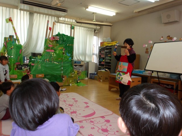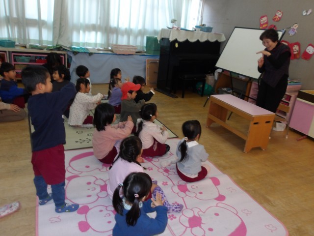 地域で活動しておられるお話の会『クリーク』さんが来てくださいました。絵本や紙芝居、手遊びやパネルシアターなど楽しいお話をたくさんしてくださいました。子ども達は、お話の世界に入り込み、笑ったりハラハラしたり不思議がったりと表情豊かに聞いていました。