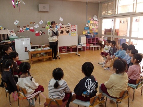 もも組に目の大切さについて保健指導をしました。テレビやゲームを長い時間見ていると、おうちのひとに「そろそろやめようね」「目が悪くなるよ」と言われたことはないか聞くと、ほとんどの子どもたちが「言われたことある」「ご飯見るまでねって約束してる」と言っていました。そこで、長い間テレビやゲームをしていると、目が赤くなったり、痛くなったりすることと、目が見えづらくなるとどんなふうに見えるのかを写真を使って知らせました。目と画面の距離についてもお話しすると、「いつもやってるで!」「おうちの人に教えてあげよう」と言っていました。