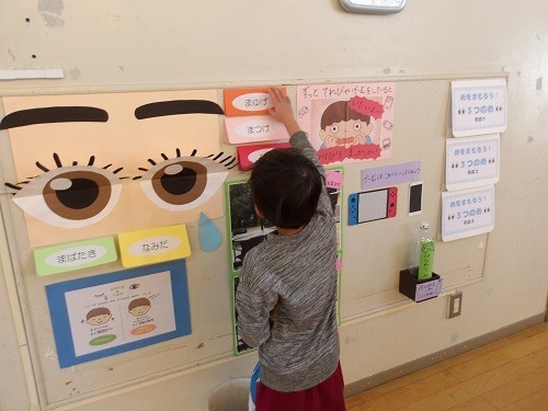 すべてのクラスの保健指導が終わったので、使用した教材を掲示板に貼ると、早速みんな見たり触ったりして、保健指導のお話を思い出していました。すべての内容を覚えて、養護教諭に教えに来てくれるこどもたちもいました。