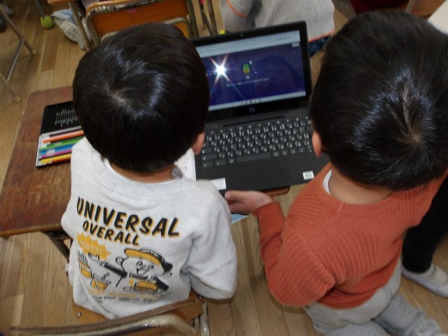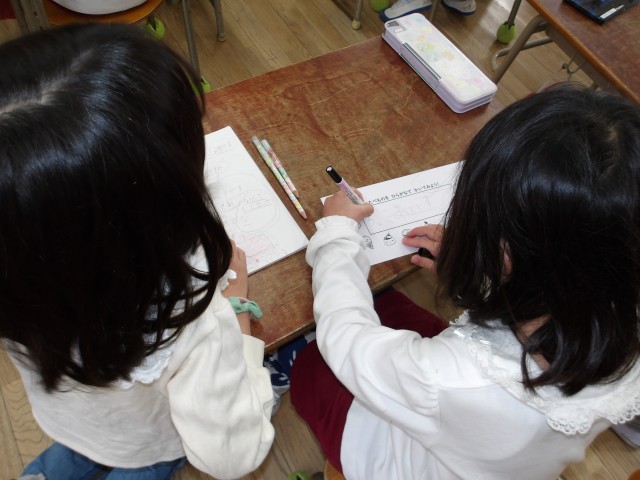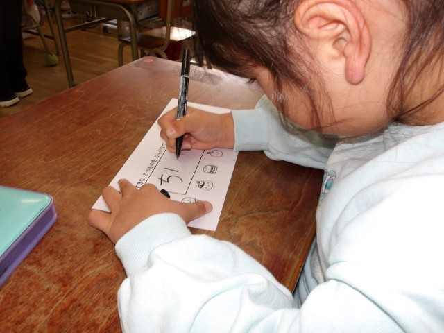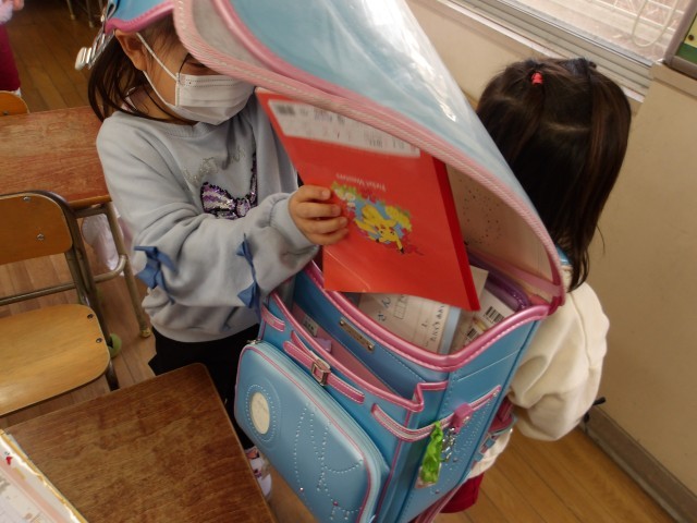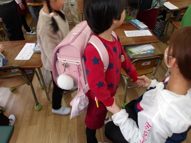 住吉小学校の1年生の教室に行かせていただき、小学校の授業を体験させてもらいました。数字の勉強をしたり、実際に鉛筆で好きな食べ物を一年生が書いてくれたものをペンでなぞらせてもらったりしました。パソコンを使って小学校クイズをして、「〇だった」と帰ってからも話していました。ランドセルをからの状態から、一冊ずつ教科書を入れてもらい、「まだ大丈夫」「持てる、持てる」とランドセル体験もさせてもらい、楽しんでいました。実際の優しくしてくれる1年生に子どもたちは、緊張しながらも教えてもらい、嬉しそうにしていました。1年生のお兄さんお姉さん、ありがとうございました。