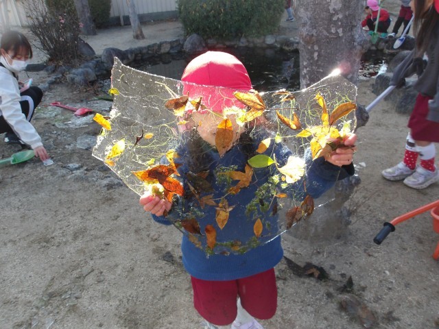 昨日に引き続き、今日も池の水が凍っていました。今日は、昨日よりも大きく、分厚く凍っていて、「あの氷大きい!」「ここにもあるで」と大きい氷を触りたい子どもたち。でも、割らないように持ち上げるのはなかなか難しく、スコップを持ってきたり、先生と協力したりして、やっと大きい氷を持ち上げることができました。子どもたちの顔よりも大きい氷は、池に浮かんでいた葉っぱも一緒に凍ったようで、「氷に葉っぱが入ってる!」「きれいやな」と、大きくてきれいな氷に感動していました。氷で遊んだ後は、桶にあったかいお湯を入れて、冷えた手をみんなで温めました。