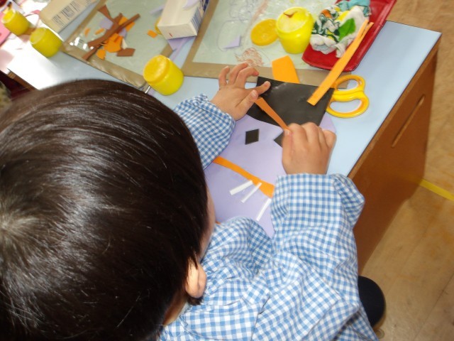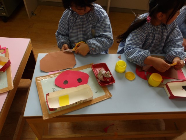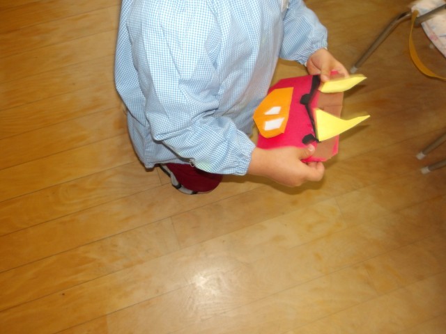 節分の鬼を作りました。「かわいい鬼できた」「鬼だぞ、ガオー」「おお、こわい」と言うなど、作ってからも遊んで楽しんでいました。