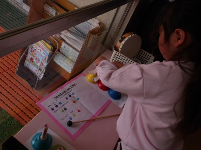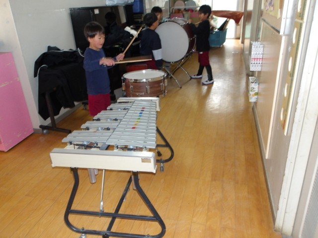 曲をかけながら、それぞれが自分の好きな楽器を選んで、みんなで演奏しています。友達に教えてもらったり、自分で練習していたり、思い切って鳴らしていたり、それぞれが曲に親しんで遊んでいます。生活発表会で見てもらうことが楽しみですね。