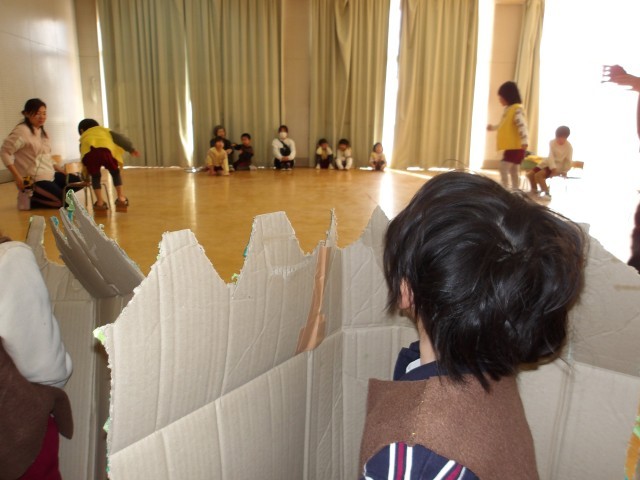 劇遊びを楽しんできて、自分の好きな役になって遊んでいます。自分の役を一生懸命になって表現したり、友達のしている役を見ていたりしています。絵本を思い出しながら、大きく動いたり、倒れたり、みんなで考えながら進めています。