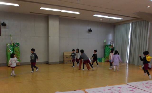毎日やっていても、登園してくると「やりたい」とお話の世界に入っている子どもたち。少しずつ役を変えたり、言葉を変えたり、動き方を変えたり。物の出し入れをしたりして、楽しんでいます。