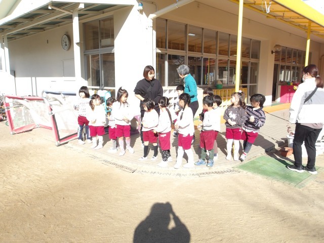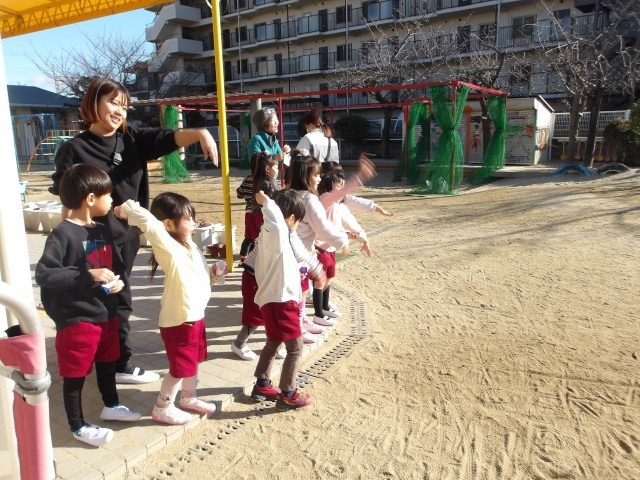 折り紙で、コップや三宝を折り、先生に少しずつ豆をもらいました。自分の中にいる弱い部分を追い出そうと話をして、豆をまいて、弱虫やおこりんぼうを追い出すことにしました。弱い部分を追い出した子どもたちは、心も体も大きくなり、今日も元気いっぱいに遊ぶことができました。