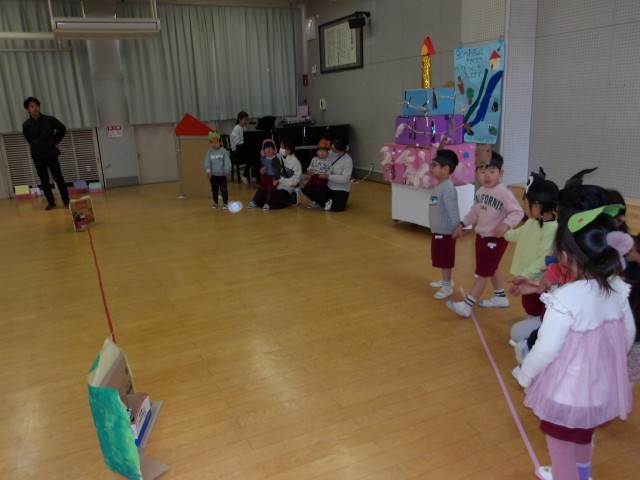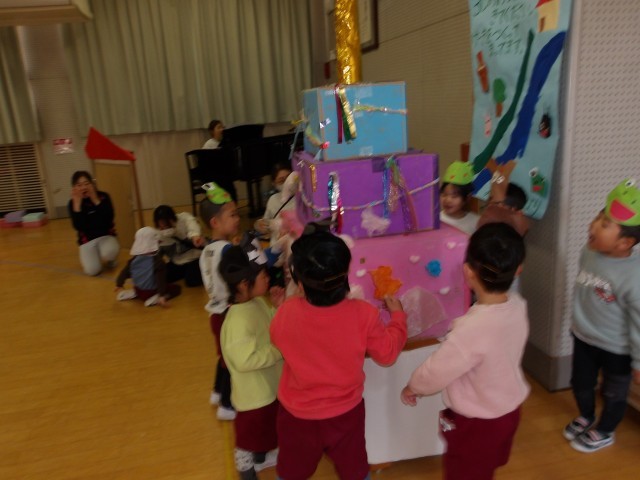 「今日も頑張るよ」とカエルさんになったり、自分のなりたい動物になったり、大きな声でセリフを言っていました。みんなで遊ぶことが大好きなもも組です。おいしいケーキを食べたら、おなか一杯になりました。