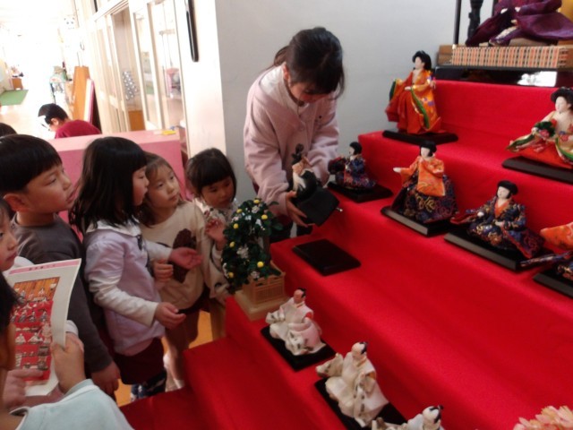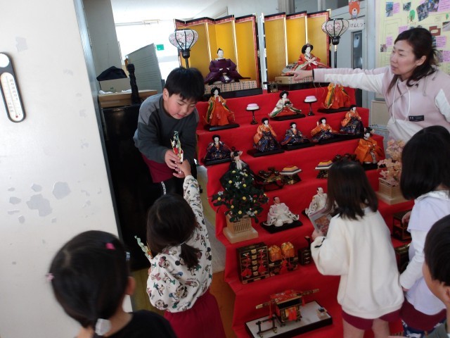 あお組みんなで、箱から大事に出してひな壇を飾りました。箱から出した人形やお道具を抱え、「地図(雛段飾りの写真)持ってる人,見て、これはどこ?」とみんなで大事そうに飾っていきました。「これは何する人やろう?」と考えていたり、「この人の顔、怒ってる、こっちは泣いてる」など言いながら顔を覗きこんだり、お道具の鏡で自分の顔を見ていた「正しい使い方やな」と言われたりしていました。最後はきれいに箱を片付けて、「この前で写真撮ろう」と満足して、みんなで写真を撮りました。