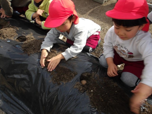 あか組みんなでじゃがいもの種芋を植えました。種芋を見ると、「チューリップの球根みたい」「じゃがいもの種かな?」「これじゃがいもだよ」と興味を示していました。そして、種芋を植えて上から優しく土の布団をかけてあげました。最後には、水やりをし、「早くじゃがいも食べたいな」と楽しみな様子です。みんなで、水やりをしながら、じゃがいもが大きくなるのを見ていきたいと思います。