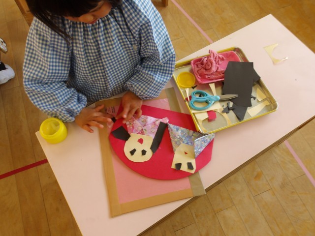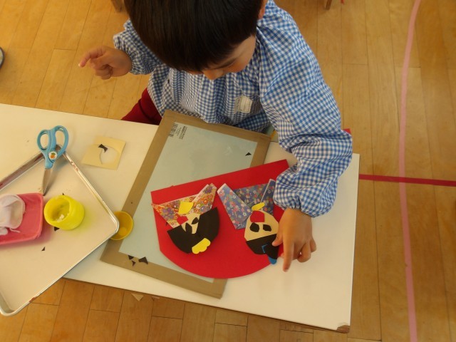 おひなさまを製作するときに、「手に何もってるんやろ?」「髪の毛に何ついてるんかな?」という話になり、幼稚園に飾ってあるひな壇を見に行きました。「帽子かぶってる」「暑いから仰ぐやつ(扇)持ってるんかな?」と興味をもって見ている様子がありました。