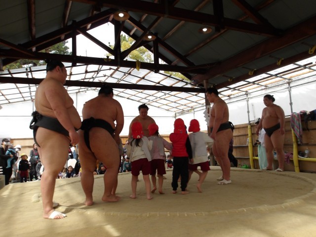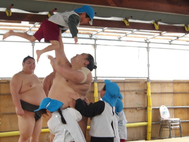 住吉大社で宿泊している立浪部屋の力士の方の朝稽古を見せていただいたり、土俵に上がらせてもらい、お相撲を体験させていただきました。大きなお相撲さんを前に、子どもたちはびっくりしていましたが、「負けないぞ」と張り切って土俵に上がって、お相撲さんに向かって言っていました。優しいお相撲さんとの触れ合いを楽しんでいました。ご飯を「ちゃんこ」ということや、土俵の砂を足の指先で捕まえて相撲を取っていることやちょんまげを結っていることの意味を教えてもらったりして、お相撲さんのことをたくさん知ることができました。立浪親方、立浪部屋の力士さん、住吉大社の皆様、ありがとうございました。住吉警察から「ゆうかいするぞう」さんも来て、お相撲さんと一緒に防犯教室もしていただきました。ありがとうございました。