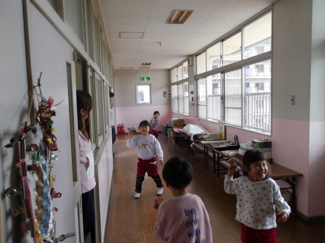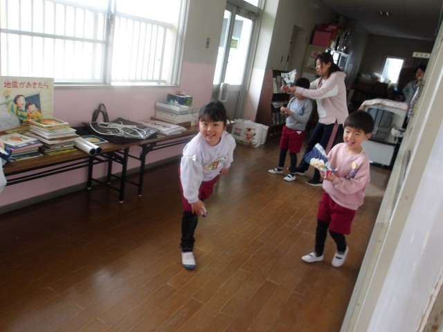最後のグループが、園長室でお弁当を食べました。クラスの友達に園長室で聞いてきたことを楽しみに、笑顔で2階に上がってきました。みんなでおしゃべりをしながら、楽しくお弁当を食べました。その後、紙飛行機を折って、どの紙飛行機がよく飛ぶかを競って遊びました。お家の人に園長室の黒電話で電話をかけて、お母さんとしゃべって嬉しそうでした。