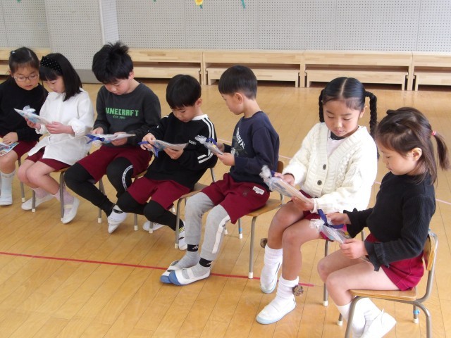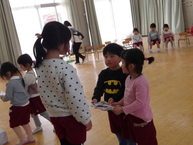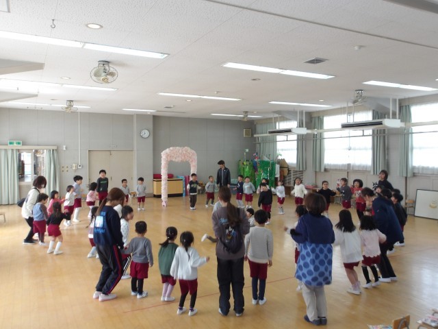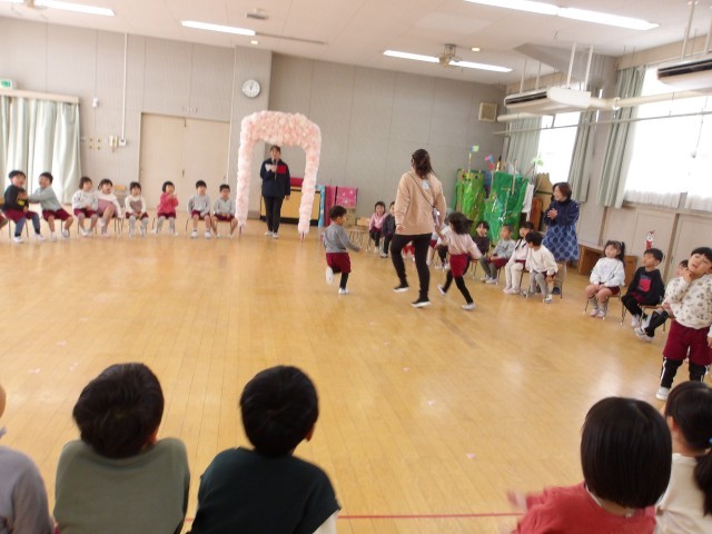 あお組のお別れ会をしました。あか組、もも組があお組を拍手で迎え、あお組は恥ずかしそうにしながらも、笑顔で入場してきました。初めに、3月2日で住吉幼稚園が101回目の誕生日を迎え、幼稚園のみんなが一つ大きくなったので、ろうそくを4,5,6そして101歳の1本をたてた誕生日ケーキのパネルシアターでお祝いをしました。住吉幼稚園みんなで、今年度の誕生日をお祝いして、『誕生月なかま』で遊びました。みんなが一つ大きくなり、もうすぐ、あお組とお別れなので、思い出を話したり、「オズの魔法使いかっこよかったよ」「お弁当の食べ方を教えてくれてありがとう」など、あお組への思いを自分なりの言葉で伝えたりしました。もも組とあか組からは、心を込めて作ったフォトフレームのプレゼントをしました。あお組は喜んで、飾りや写真を嬉しそうに、じっくりと眺めていました。あお組からは、歌のプレゼントをしたいと言ってくれて、歌を聞かせてもらい、心がぽかぽかあったかくなりました。「住吉幼稚園の友達みんなが友達」「みんなで手をつないで『ともだちできちゃった』のダンスしよう」となり、子どもも先生も誘い合いながら、みんなでひとつの大きな丸になって、手をつないでダンスをすることができました。終わったときには自然と大きな拍手が起こりました。最後のお別れ会で、みんなの心が一つになって楽しかったです。