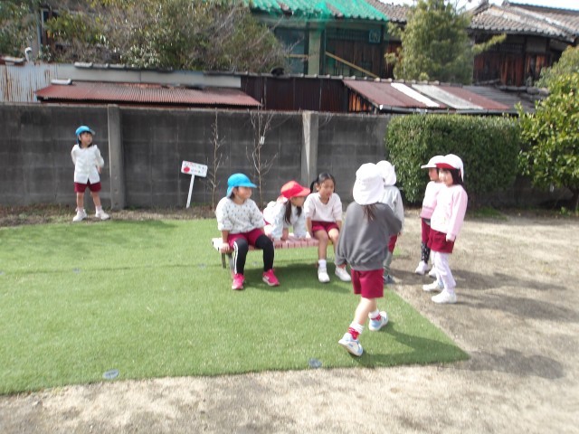 お別れ会が進んでいき、お弁当の時間が近づいてくると「お腹すいたな」「みんなでお弁当も食べたい」という声が、子どもたちの中から聞こえてきました。あか組はリズム室でござを並べたり、机を運んだりして準備をしました。あお組が来るとあか組ともも組が積極的に「〇〇くん、一緒に食べよう」と言って誘っていました。同じおかずが入っていて喜んでいたり、話をしたりしながら楽しく食べていました。その後は、子どもたちの希望で、みんなで園庭で遊びました。いつも以上に、いろいろなクラスが混じりあって、鬼ごっこやひなたぼっこをして遊んでいました。あお組との別れを惜しみながらも、とても楽しい1日になりました。