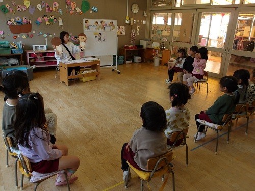 あか組によい姿勢について保健指導をしました。よい姿勢とよくない姿勢のイラストを見せ、どうすればよくなるかを話し合いました。「背中が曲がっているから、まっすぐにしないと」「足バタバタもよくないよ」と気づき、教えてくれました。よい姿勢の合言葉「せなかピン、あしはピタ、てはおひざ」を知らせると、すぐにみんなでよい姿勢になりました。