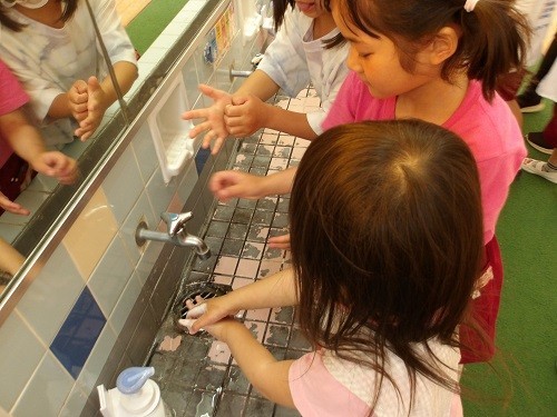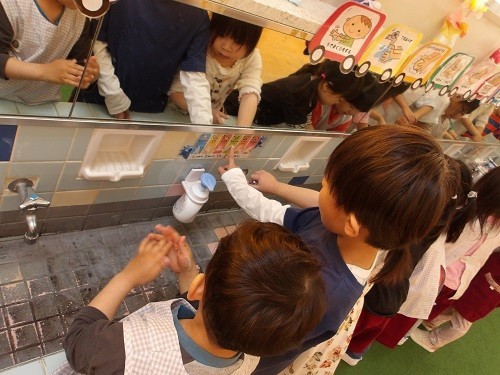 もも組に手洗いの保健指導をしました。もも組さんは初めての保健指導だったので、今日は、あお組のおにいさん・おねえさんが一緒に上手な手の洗い方を教えてくれました。保育室で手洗いのひとつひとつのポーズを練習した後に、実際に水道で手洗いをしてみました。優しく教えてくれるあお組さんと一緒にもも組さんも上手に手洗いをしていました。