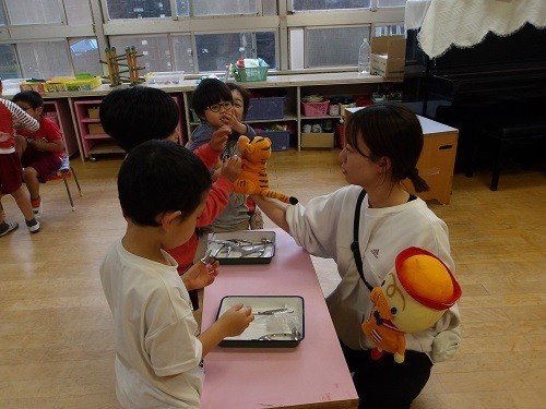 明日は耳鼻科検診です。今日は耳鼻科検診で使う器具に親しむため、実際の器具を使ってお医者さんごっこをしました。子どもたちが器具を触って、ぬいぐるみが元気かどうか調べました。「今日はお医者さんをしたけど、明日は患者さんをするよ」と言われると、「楽しみ!」「上手にできるよ!」とやる気いっぱいでした。