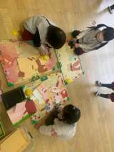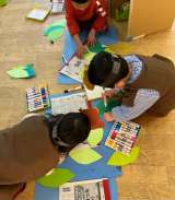 劇遊びで飾る背景をつくっています。 ぶたちゃんは葉っぱのところが好きかな?と、草...
