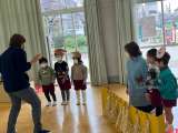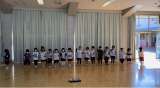 みんなでカスタネットを持って、並んで楽器を鳴らしてみました。先生のしている様子を...