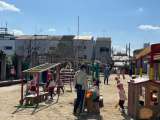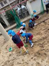 寒い中でも外で元気に遊ぶ子どもたち。砂場では、汽車が進む線路をみんなで掘ってつく...