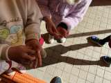 足の裏を見せて、「この足で、音が鳴る」「聞いて」と走ったり飛んだりして、いろいろ...
