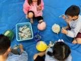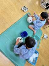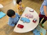 昨日につくった新聞紙の張子を見て、「固くなってる」と驚いた様子のあお組。今日は白...