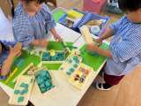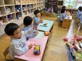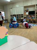 ソフト積み木で作った車、友達に押してもらわないと動かないので、友達が押してくれま...