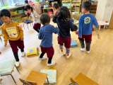 初めは椅子を使って、椅子取りゲームをしていたもも組。しばらくすると、床に座布団を...
