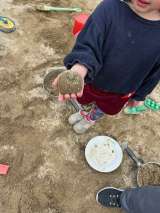 砂場で、ままごとをしたり、先生と一緒に電車ごっこをしたりして、遊びました。 自分...