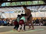 土俵に上がって、5人で力士の方と対戦しました。「おすもうの、はっきょいのこったし...