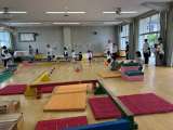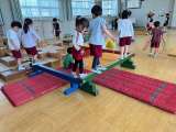 あお組が大型積み木を並べたり、巧技台でハシゴや一本橋、滑り台やトンネルを並べて、...