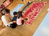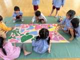 大きな鯉のぼりを作ろうと、うろこになる紙に絵をかきました。模様になっている子ども...