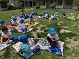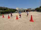 幼稚園を出発した時は曇りだった天気が東粉浜小学校に着いた時には、晴れてきて、芝生...