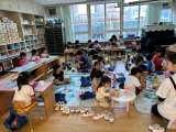 東粉浜小学校の校庭で給食の様子を見たり、給食室をのぞいて大きなお鍋を見たりしまし...