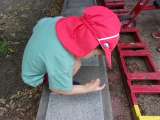 園庭でゆび絵の具で感触を楽しみました。初めてのことにドキドキして、友達の様子を見...
