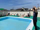 あお組の「オープンザ・ドア」のかけ声でプール開きが始まりました。きちんと並んでプ...