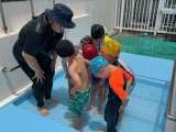 少しずつ水に慣れてきました。見学の子どももプールサイドで水にふれて遊びました。
