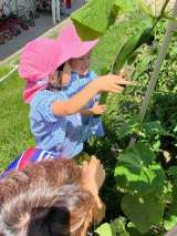 畑のきゅうりが急に大きくなりました。幼稚園用に育てていたものを、もも組さんが収穫...