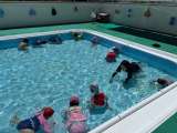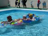 浮き輪でつながって泳ぐの楽しいね。ロープの下もくぐれるよ。「もぐれるから大丈夫」...