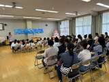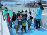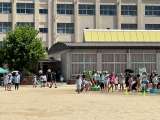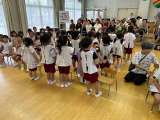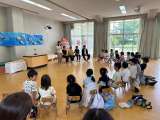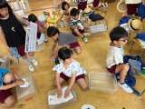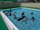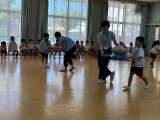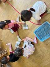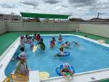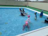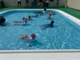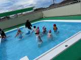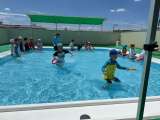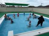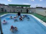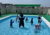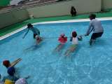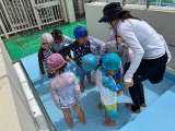 もも組さんは、プールの中でケンケンをしたりお尻歩きをしたりいろいろな歩き方をして...