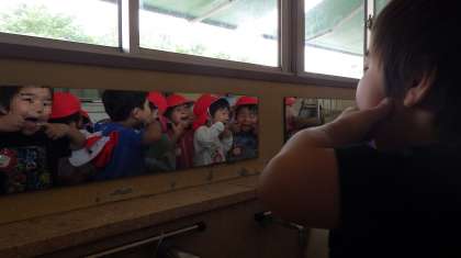 自分たちの歯がどうなっているのか鏡で見ています。「あー!の口」「いー!の口」「大きい歯と小さい歯がある」など鏡を見ながら呟いたり、笑いあったりしました。