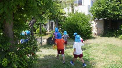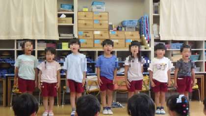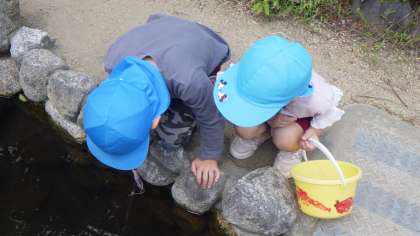 住吉幼稚園の5歳児あお組にザリガニ釣りの約束を教えてもらい、ゆり組も挑戦!岩場に隠れることが上手なザリガニ。やっと見つけた!と思っても、釣り上げるときに釣り竿から落ちてしまうことも…。釣れた時には、「やった!釣れた〜」と、嬉しそうにしていました。あお組さんの保育室で「ホ!ホ!ホ!」を聞かせてもらった後、「にじの向こうに」を大きな声で歌いました。帰るときには、「まだ帰りたくない〜!」「また来たい!」と言い、さよならすることを惜しんでいました。