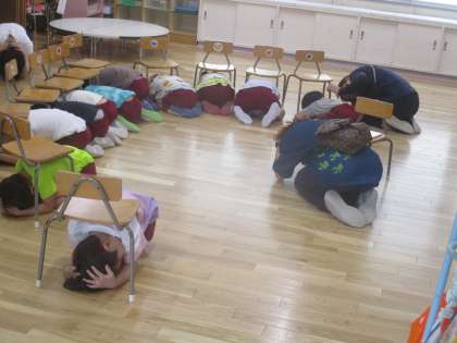一報を聞いた子どもたちは、頭を守り、じっとして指示を待ちます。園庭に避難した後、津波発生の連絡を受けて墨江小学校へ避難しました。