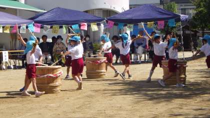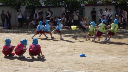 綱引きやリレーでは、最後まで友達と協力し、友達と勝ったことを喜んだり、負けて友達と励まし合ったりする姿が見られました。「ゆり組さいきょうオリンピック!」では、バスケットボール選手や野球選手になりきって遊んだり、気持ちを一つに樽太鼓をしたりしました。一人で司会をしたり、自分たちで準備をしたり、ばら組のお手伝いをしたりと、ゆり組の競技や演技以外の場でも大活躍のゆり組の子どもたちでした。