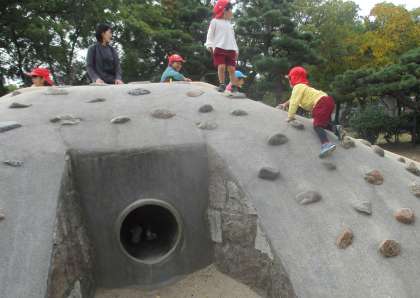 「おーい!」と土管の入り口から、向こうに見える友達に声をかけたり、「これ、どうやって降りるの?」と、少し難しい太鼓橋に挑戦したりしていました。