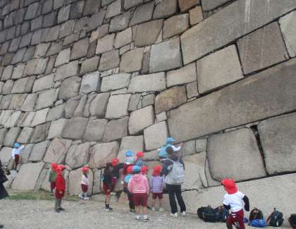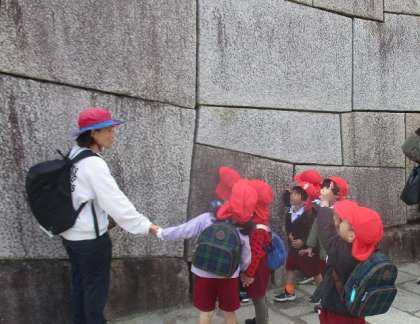 子どもたちは、大きな石垣の隙間に薄い石が詰められているのを見つけたり、「階段も大きな石でできてるよ」と気付いたりしていました。