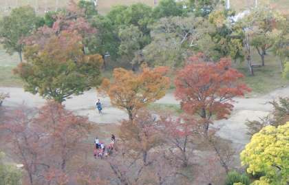 天守閣に上ったゆり組が、西の丸庭園にいるばら組に手を振りました。紅葉の中に小さく見えたばら組でしたが、「ゆりぐみさーん」と呼んでいる声はしっかり届いてきました。